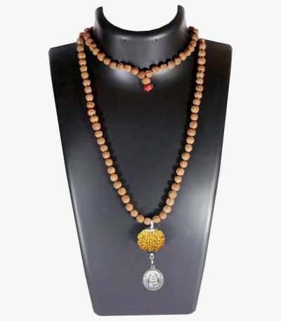 Design- Rudraksha Made In Pure 925 Silver Caps + Silver Lord Ganesh Yantra Attached With 5 Mukhi Indonesian Rudraksha Mala.
