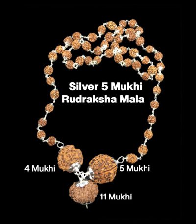 Design- All Beads Will Be Capped In Pure Silver Caps And Attached To Silver 5 Mukhi Rudraksha Mala.