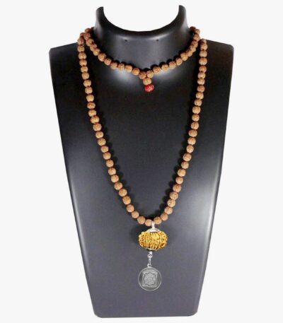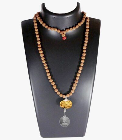Design- Rudraksha Made In Pure 925 Silver Caps + Silver Mahamritunjaya Yantra Attached With 5 Mukhi Indonesian Rudraksha Mala.