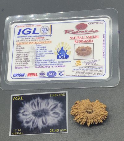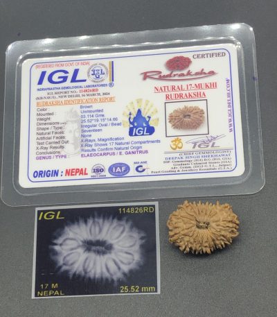 17 mukhi Rudraksha is ruled by Katyayani Devi, the 6th form of Durga. Individual who reveres this form of goddess achieves all the four principles, 'Dharma', 'Artha', โ€˜Kama' and 'Moksha'. This Rudraksha decimates the constraining convictions of the wearer in slow course of time and subsequently decimates past Karma. The native turns into a jivanmukta, a freed individual while still alive. He or she will acquire the 8 divine paranormal powers (siddhis) and the 32 minor paranormal powers. On a psychic level, it controls the unrivalled instinct, insightfulness, clairvoyant limits, restraint and imaginative insight. It is exceptionally gainful for venture pioneers, agents and political pioneers and individuals coveting development in vocation. It favours the wearer with enormous influence of making of riches and heavenly attraction and gives satisfaction of having a good life partner, offspring, good fortunes and successes. Gives freedom from diseases, misfortunes, bitterness and fears. Helps find a suitable life partner; have obedient children, good fortunes and success. Uproots deterrents in way and gives tremendous thriving. 17 mukhi Rudraksha acts upon the third eye chakra of planet Saturn. When this chakra is in balance, the person becomes charismatic, brilliant and calm with clarity of thoughts.