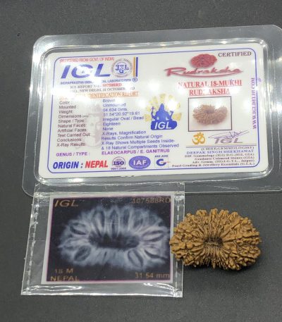 18 Mukhi Rudraksha represents Maa Bhoomi Devi. It helps to attain victory in all the affairs of life. Eighteen Mukhi Rudraksha removes the vice of lust, attachment and ego. It helps to remove laziness and fatigue. It is highly beneficial for students who makes them discipline and full of concentration. It balances the kapha dosha and earth element.This Rudraksha have 18 Eighteen powers in it which protects the wearer from all kinds of evils and problems. It removes the laziness and excessive sleep from the wearer of this Rudraksha. This Rudraksha helps in Ayurveda, chemical process, cloths etc. This Rudraksha gives all kind of Bhoga ( comforts and leisure) to the wearer. It removes all kind of sins and in the end liberate the wearer in the end of life. It helps in attaining all kind of attainments.
