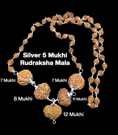 Rudraksha Combination for Business Power (Executives & Businessmen) 7,7,8,11,12 Mukhi Nepal in Silver Mala