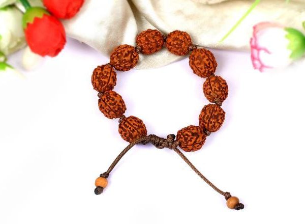 Bracelet made of uniform and superior quality 5 mukhi Rudraksha beads from Java beads separated by knots is strung in adjustable thread. This powerful healing bracelet in stretch elastic can be used as regular wear accessory. It is for those going through Guru (Jupiter) dasha as it helps pacify the malefic of Guru Planet. It affects all major chakras and gives health and peace. Five mukhi represents Rudra Kalagni. Jabalopanishad states it as form of Lord Brahma also.