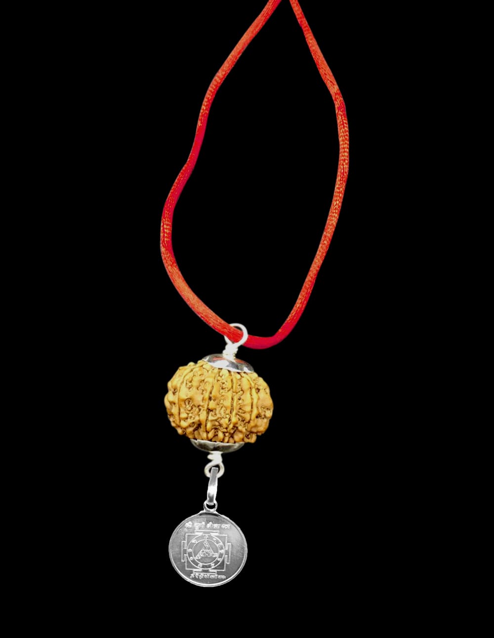 Design- Rudraksha Made In Pure 925 Silver Caps + Goddess Durga Yantra In Silver With Red Thread.