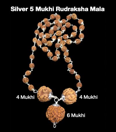 Design- All Beads Will Be Capped In Pure Silver Caps And Attached To Silver 5 Mukhi Rudraksha Mala.